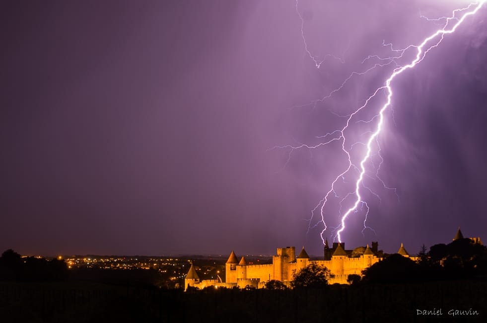 Chute de foudre en début de nuit à Carcassonne, photographiée par Daniel Gauvin :