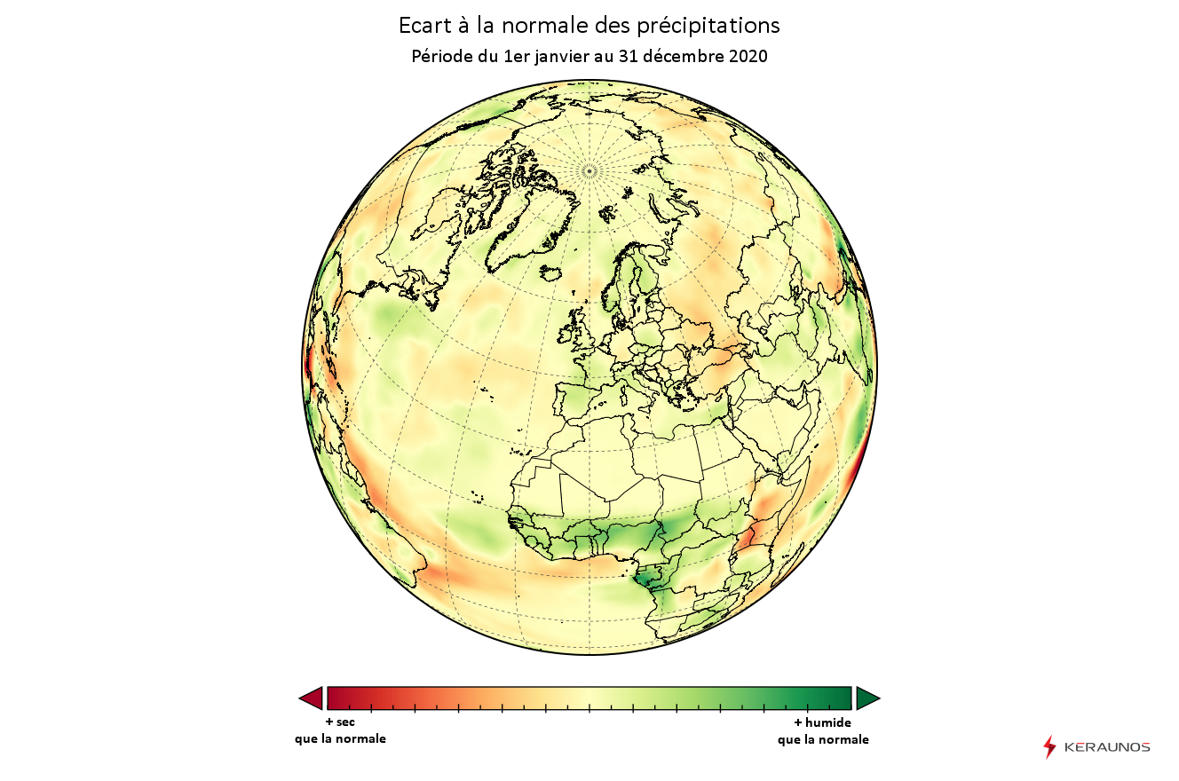 L'année 2020 a été plus instable que la normale sur le sud-ouest et le nord de l'Europe, et à l'inverse plus stable que la normale dans sa partie centrale. La France s'est située au carrefour entre ces deux influences, avec par conséquent une instabilité plus particulièrement excédentaire sur les régions
