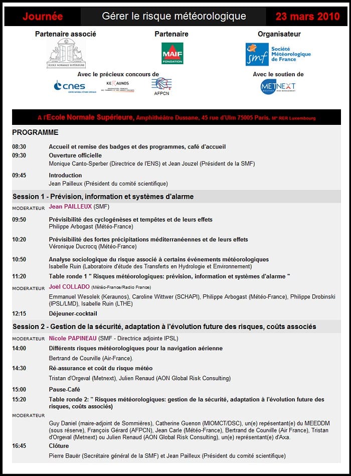 >Dans le cadre de ses journées scientifiques, la Société météorologique de France a choisi le thème de la gestion du «Risque météorologique » pour sa journée 2010. Compte tenu du large éventail de risques météorologiques, l’objectif de cette journée se limitera aux tempêtes et aux phénomènes convectifs.