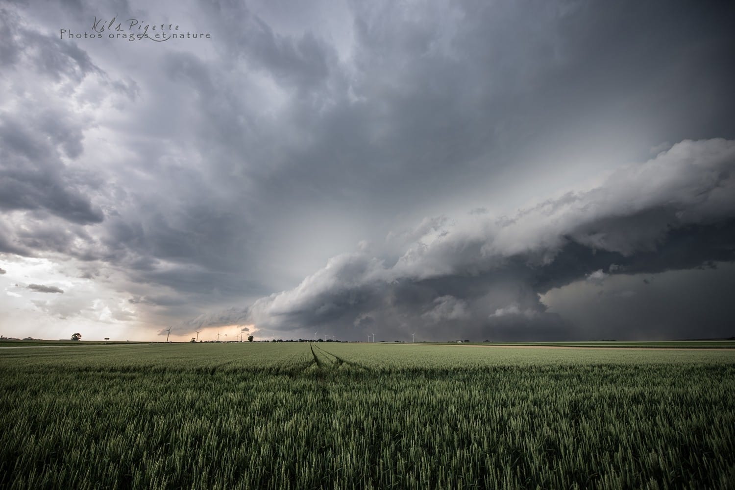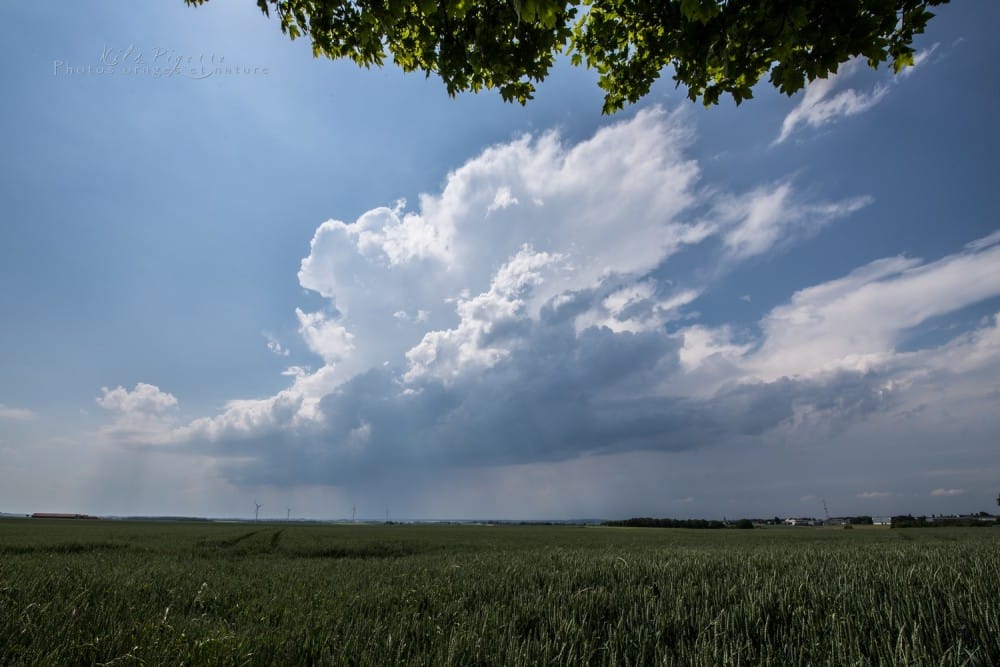 Les premières grosses gouttes m'obligent à filer plein Est pour essayer de devancer ce monstre. Arrivé à Nesles quelques kilomètres à l'Est de Roye, je me pose pour admirer de nouveau cet orage.