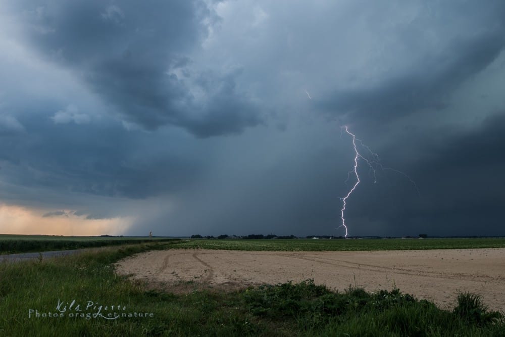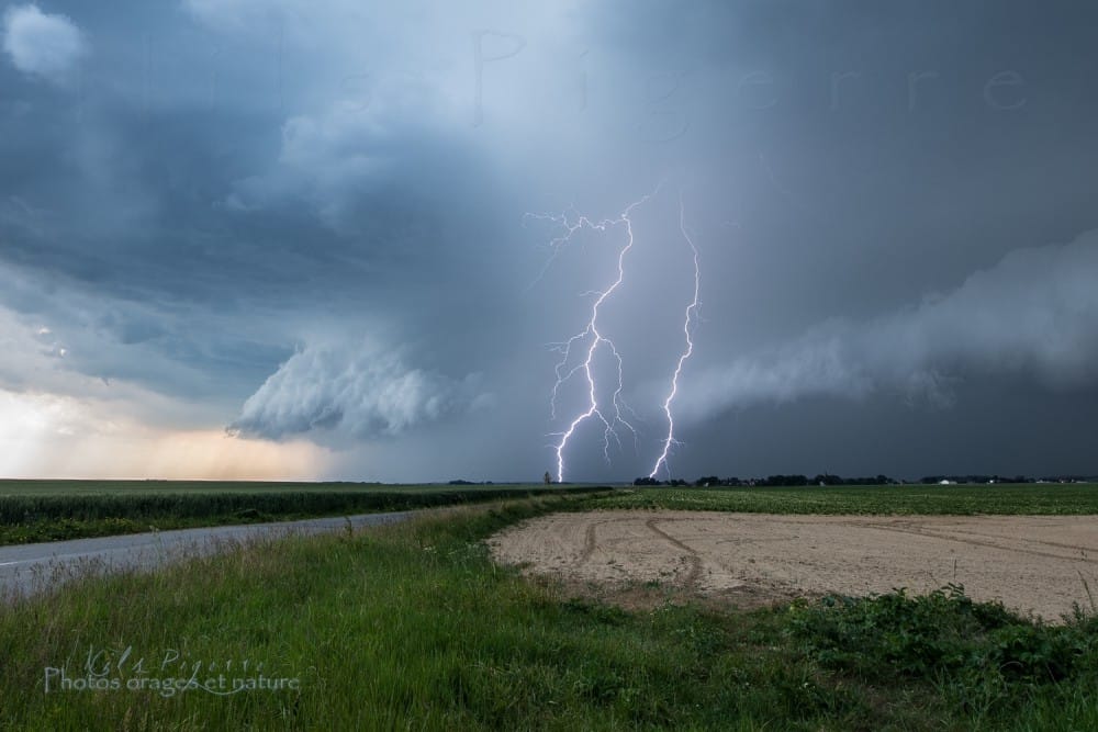 Très vite la convection reprend vigueur à l'arrière et un orage prend rapidement un caractère supercellulaire. Il traversera la Picardie de Beauvais à Saint-Quentin. Je l'intercepte à 10 km à l'Ouest de Roye (80). La foudre impacte souvent dans l'air sec : photo "impact de foudre ramifié Roye"