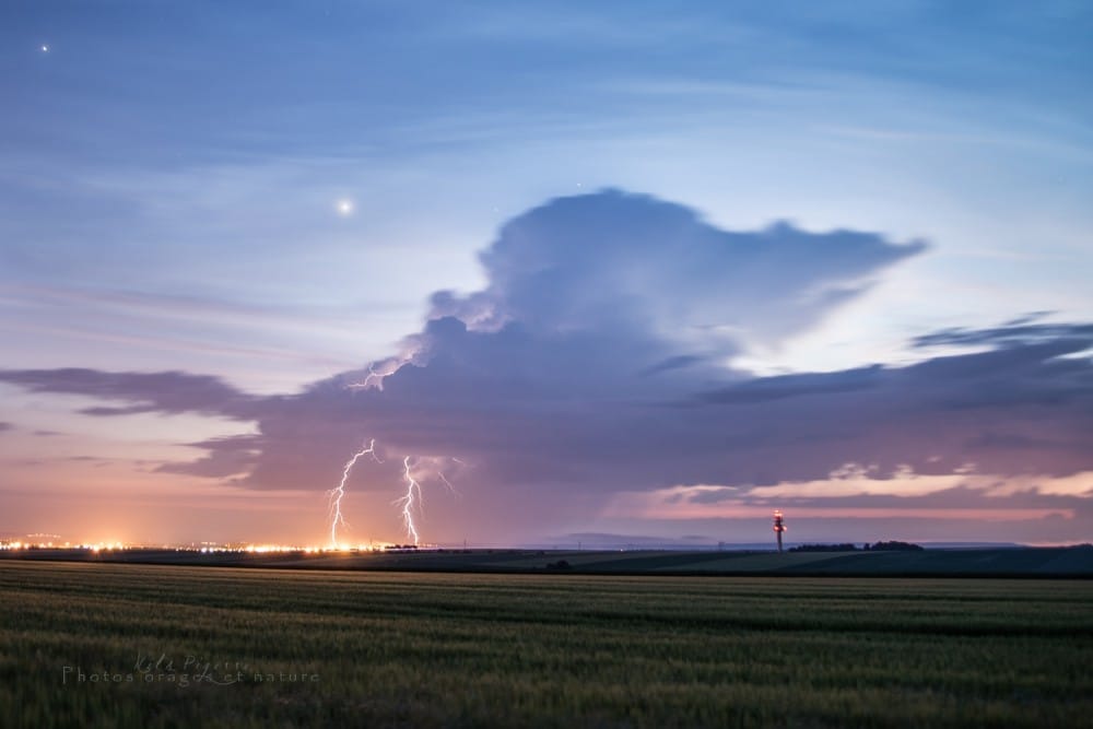 En soirée un orage de type monocellulaire transite entre Sézanne et Reims. Arrivé au niveau de la Montagne de Reims, l'orage s'active subitement. Il s'agit principalement de foudre extranuageuse. Sa structure se découpe très bien sur fond de ciel étoilé :