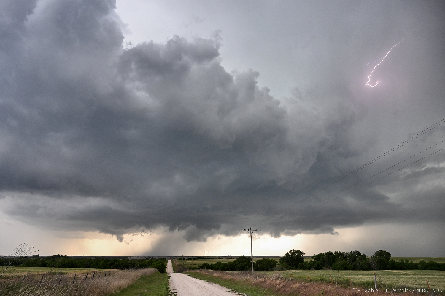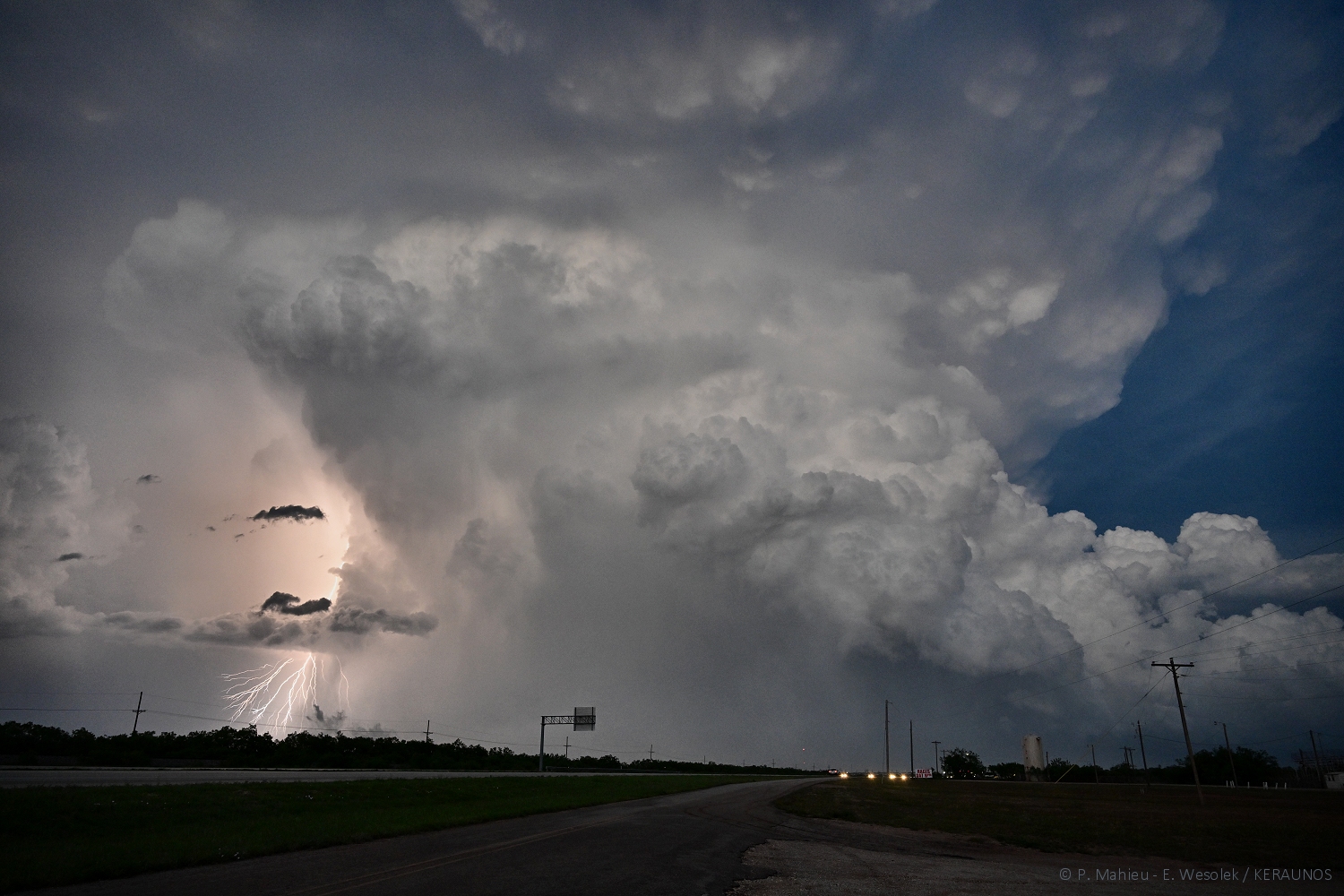 En début de nuit, une nouvelle supercellule se forme au sud-ouest d'El Reno (Oklahoma), tristement célèbre pour la tornade du 31 mai 2013, qui avait entre autres coûté la vie au chercheur américain Tim Samaras. Elle aborde le nord d'El Reno en présentant une activité électrique particulièrement soutenue. Les deux photos qui suivent montrent de puissantes chutes de foudre positives, qui s'abattent en bordure du courant descendant avant, à environ 2 kilomètres de la position :