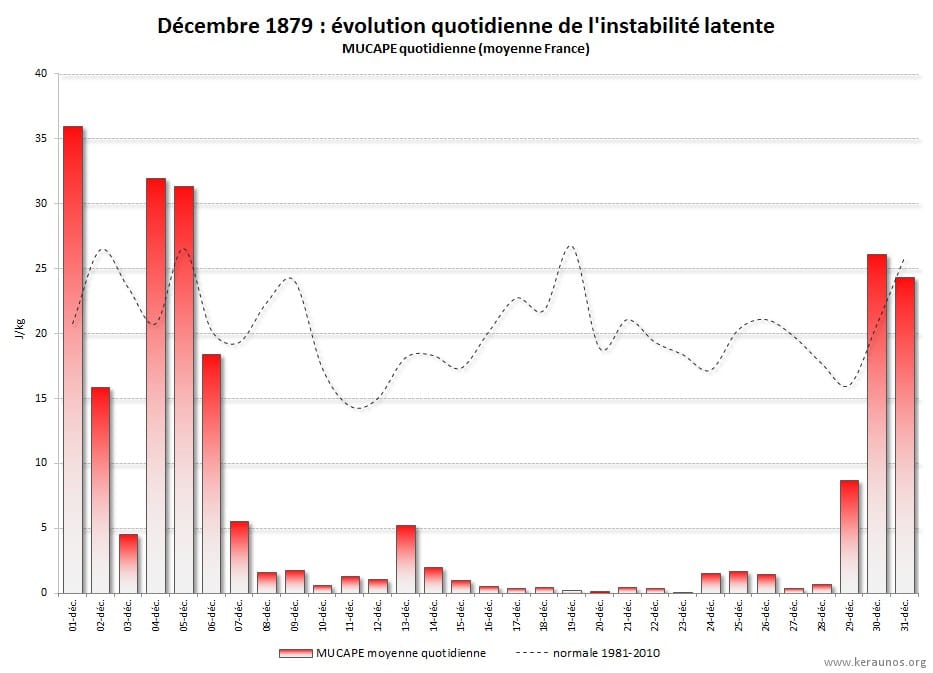 Ces conditions en moyenne très stables dissimulent toutefois deux pics d'instabilité, qui ont été observés dans les premiers jours, puis dans les derniers jours du mois. Les 1er, 4, 5 et 30 décembre 1879 présentent même une instabilité légèrement excédentaire sur la normale quotidienne :