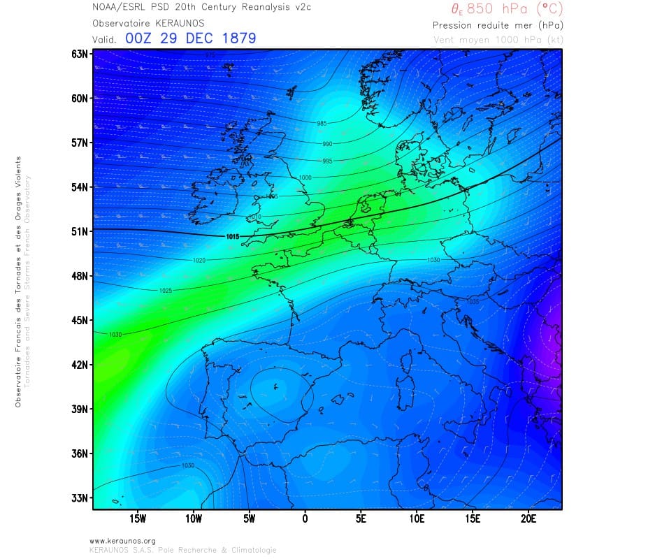 NB : les animations et champs présentés sur cette page sont produits à partir des données du programme de réanalyses "20th Century Reanalysis" mené par la NOAA, l'ESRL et le PSD. L'approche ensembliste développée par ce programme permet de reconstruire par modèle les conditions météorologiques à tous les niveaux de l'atmosphère à partir d'un nombre restreint de données d'observations. Les résultats sont certes à considérer avec une certaine prudence compte tenu des périodes reculées auxquelles ils s'appliquent, mais ils présentent un degré de fiabilité élevé qui permet une reconstruction pertinente de la plupart des épisodes météorologiques majeurs des 150 dernières années.