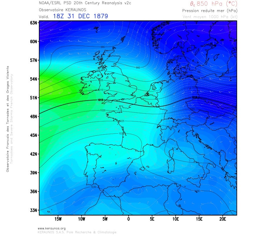 Dès les premiers jours de décembre 1879, un flux continental déjà très froid est en place sur la France. La nuit du 2 au 3 décembre est particulièrement glaciale sur le nord du pays ; associées à un faible vent de secteur est, les températures minimales s'abaissent sous les -20°C entre Ardennes et Lorraine, atteignent -19°C à Lille, et oscillent entre -12 et -14°C en région parisienne.Dans le même temps, une dépression creusée à proximité des Açores fait route vers la France tout en se creusant. Celle-ci advecte avec elle une masse d'air d'origine tropicale, générant une zone barocline très active lors de son arrivée sur notre pays, dans la nuit du 3 au 4 décembre. L'animation ci-dessous à gauche montre le minimum dépressionnaire entrer sur le sud de la Bretagne le soir du 4 décembre, avant de migrer rapidement vers l'Alsace dans la nuit, pour s'évacuer en Allemagne le lendemain.