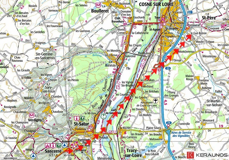 * communes traversées : SANCERRE (avenue de Verdun, Saint-Romble), SAINT-SATUR (Reine Blanche, Saint-Thibault), COSNE-COURS-SUR-LOIRE (Villechaud, les Cottereaux), SAINT-PÈRE (le Gué Botron)