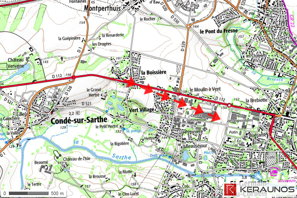 * commune traversée : CONDÉ-SUR-SARTHE (la Boissière, Vert Village, centre commercial)