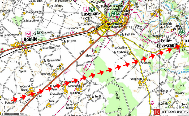 * communes traversées : ROUILLÉ (Poutort, le Grand Breuil, la Chapelatière), CELLE-LÉVESCAULT (Pousigny, le Chiron, cité du Verdier)