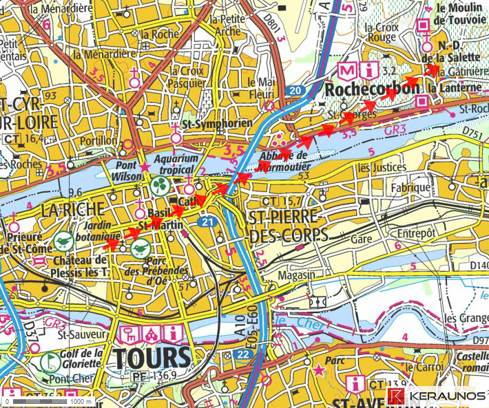 * communes traversées : TOURS (Beaumont, Rabelais, les Prébendes, Mirabeau), SAINT-PIERRE-DES-CORPS (avenue Jean Bonnin, la Loire), TOURS (la Loire), ROCHECORBON
