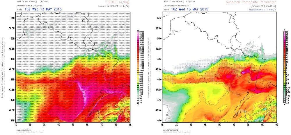 Probabilité de grêle > 2 cm prévue le 13 mai 2014 (à gauche), et de tornade (à droite). © KERAUNOS