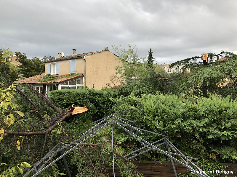 * principaux dégâts : arbres feuillus déracinés et conifères sectionnés ; habitations et bâtiments publics endommagés (tuiles délogées, pans de toitures arrachés, cheminées écroulées) ; mobilier de jardin emporté ou détruit ; plusieurs bâtiments commerciaux touchés ; projections de débris à distance (morceaux de bois, tuiles, tôles)
