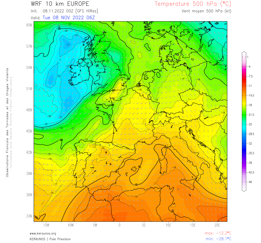 La tornade s’est formée dans un contexte fortement perturbé, dominé par un flux de sud-ouest rapide et cyclonique, piloté par un minimum d’altitude positionné au large de l’Irlande. Un front froid évolue sur la zone en fin de nuit, et c’est dans le début de traîne qu’un thalweg thermique marqué circule rapidement à l’étage moyen (-20°C à 500 hPa) :