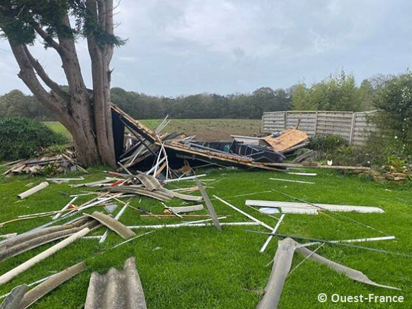 * principaux dégâts : pins sectionnés à mi-hauteur, grosses branches de feuillus arrachées, un petit arbre déraciné, appentis détruit, palissade et portail arrachés, baies vitrées d'une véranda projetées à l'intérieur, ardoises délogées