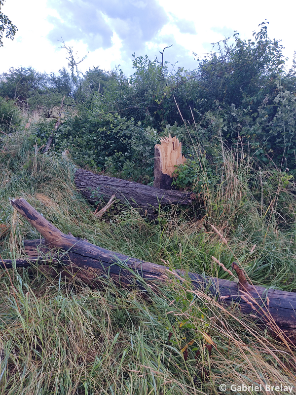 * principaux dégâts : arbres arrachés ou brisés net ; bottes de paille projetées à plusieurs dizaines de mètres ; quelques toitures endommagées ; mobilier de jardin atteint ; roulotte retournée