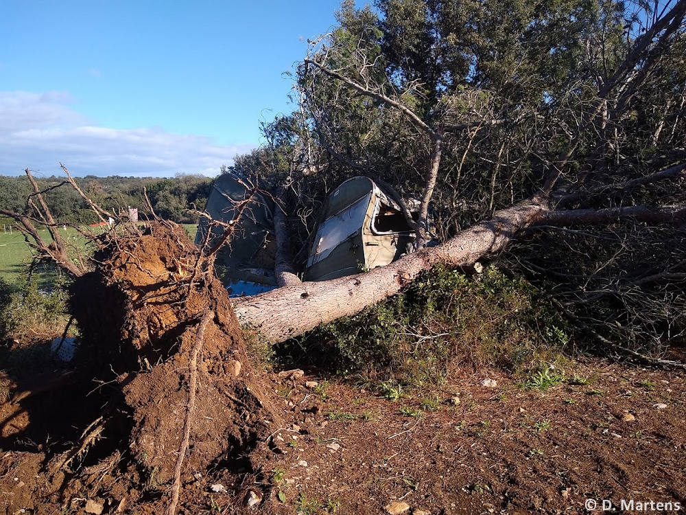 * principaux dégâts : arbres déracinés ou sectionnés (dont des pins, des oliviers, des chênes verts adultes de bonne dimension) avec faibles projections à distance ; plusieurs toitures d'habitations endommagées, dont l'une plus sérieusement ; mobilier de jardin et petites constructions soufflées ; projections à distance (poutre de 4 mètres de long, toiture d'un abri de piscine, tuiles, panneaux photovoltaïques)