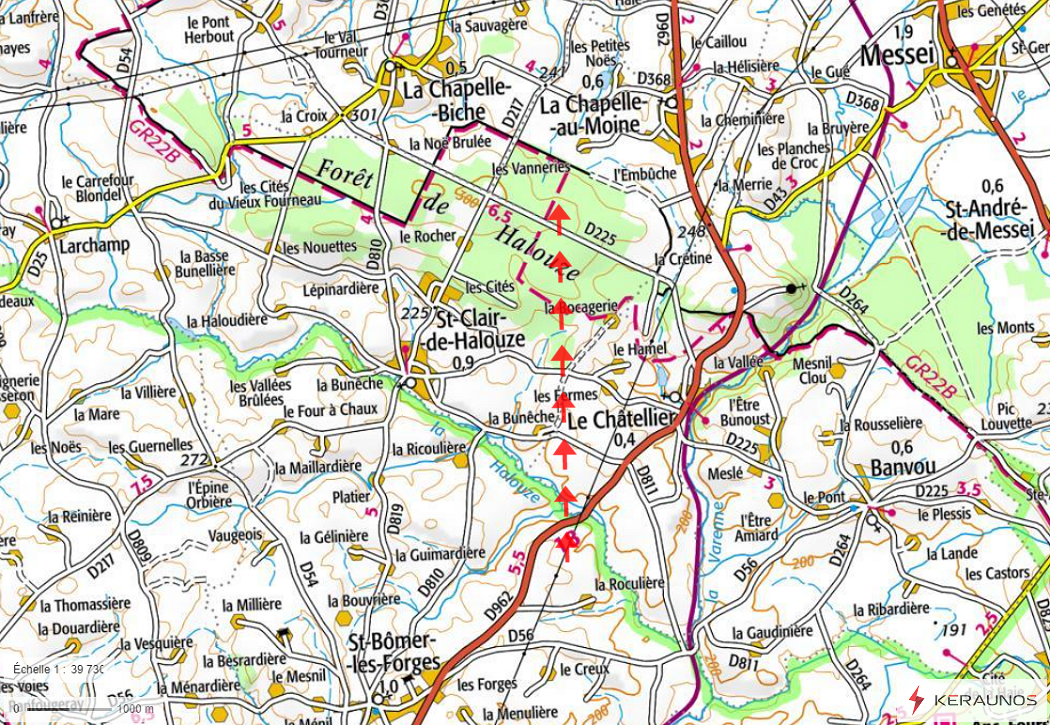 * commune(s) traversée(s) : SAINT-BÔMER-LES-FORGES (la Métairie du Moulin Rouge) ; LE CHÂTELLIER ; SAINT-CLAIR-DE-HALOUZE (forêt de Halouze) ; LA CHAPELLE-AU-MOINE (forêt de Halouze)