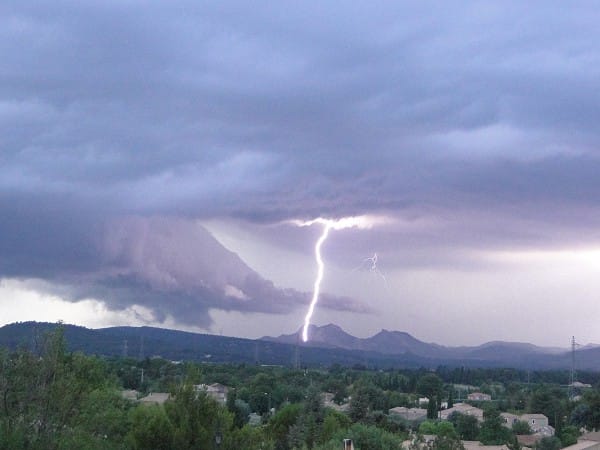 Des photographies des orages de ce soir nous parviennent, parmi lesquelles un arcus dans l'Aude (ci-dessous à gauche) et une chute de foudre sur les Alpilles (à droite) :
