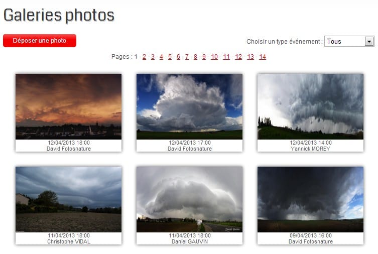 - de poster des clichés dans les galeries photos de Keraunos. Au sein des galeries, les photographies sont classées par défaut en ordre chronologique décroissant, avec possibilité de tri par type de phénomène (tornades, trombes, tubas, structures convectives, foudre, rafales convectives, inondations et grêle).