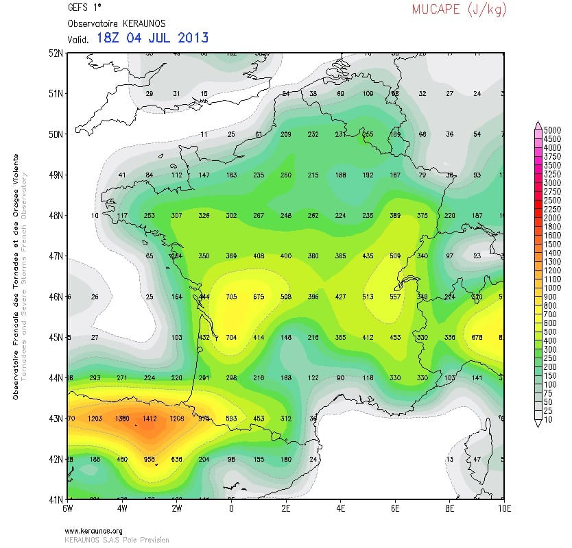 MUCAPE prévue pour le jeudi 4 juillet (à gauche) et pour le vendredi 5 juillet (à droite) à 20h locales. Moyenne des scénarios GEFS. Run du 27.06.2013 06Z.