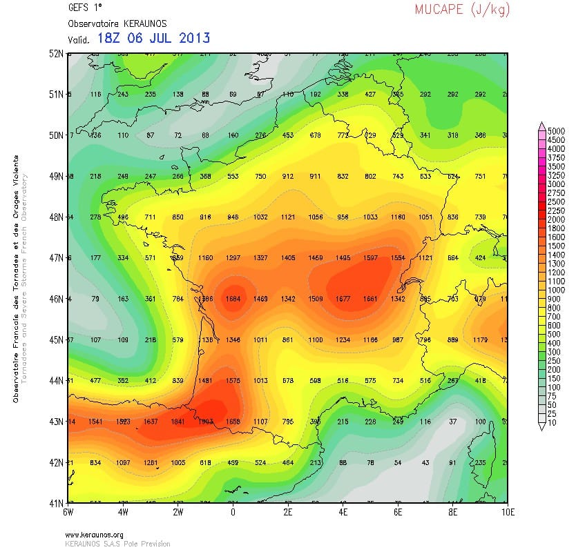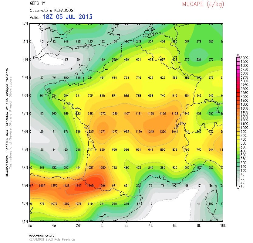 Ces afflux d'air chaud et humide en basse couche sont susceptibles de générer une instabilité latente élevée, notamment sur les deux tiers sud du pays. C'est du moins la tendance qui se dégage des modèles pour le moment, ce que confirme l'analyse de la MUCAPE prévue pour la deuxième partie de semaine prochaine via le modèle GEFS.