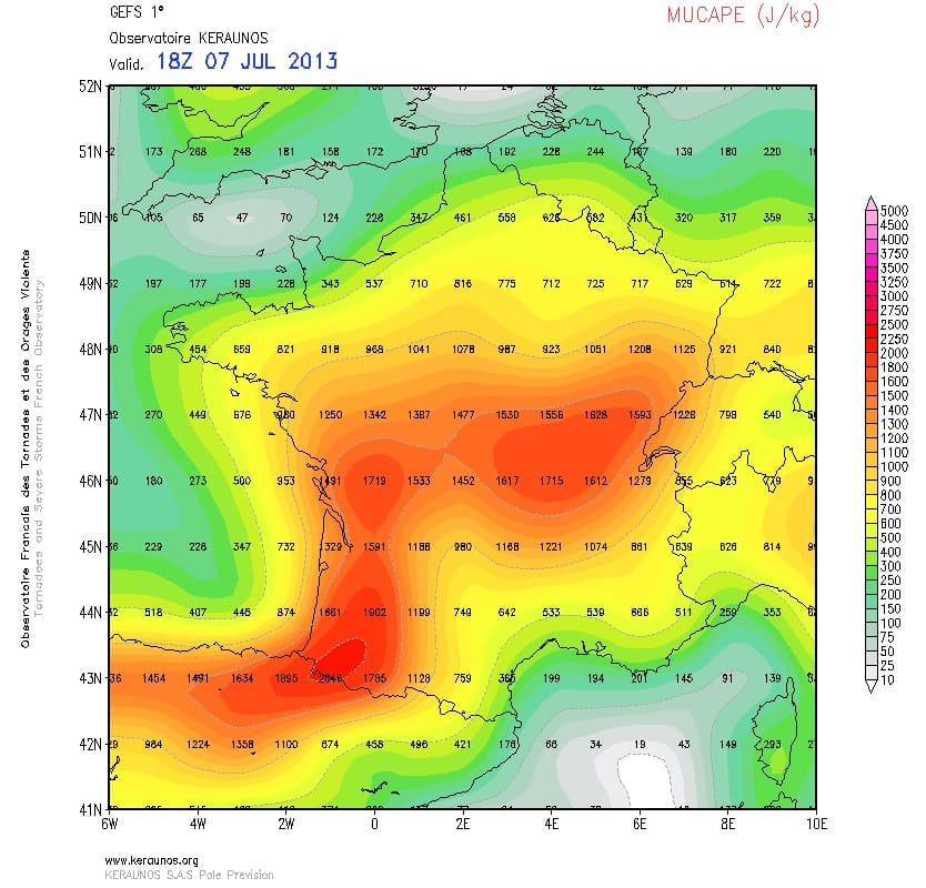 MUCAPE prévue pour le samedi 6 juillet (à gauche) et pour le dianche 7 juillet (à droite) à 20h locales. Moyenne des scénarios GEFS. Run du 27.06.2013 06Z.
