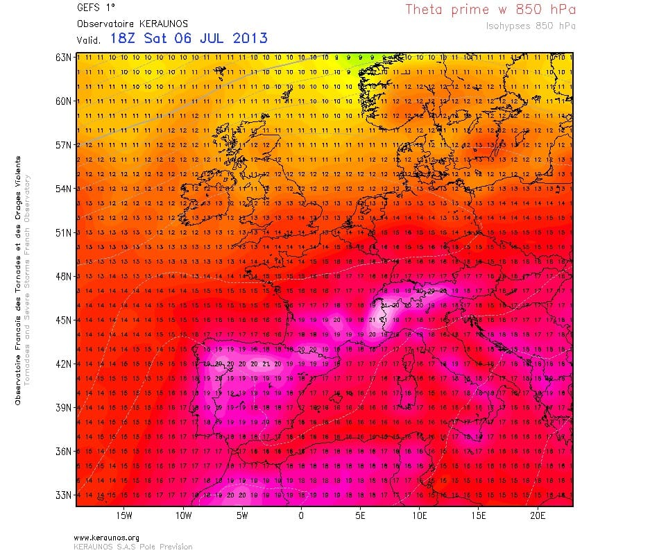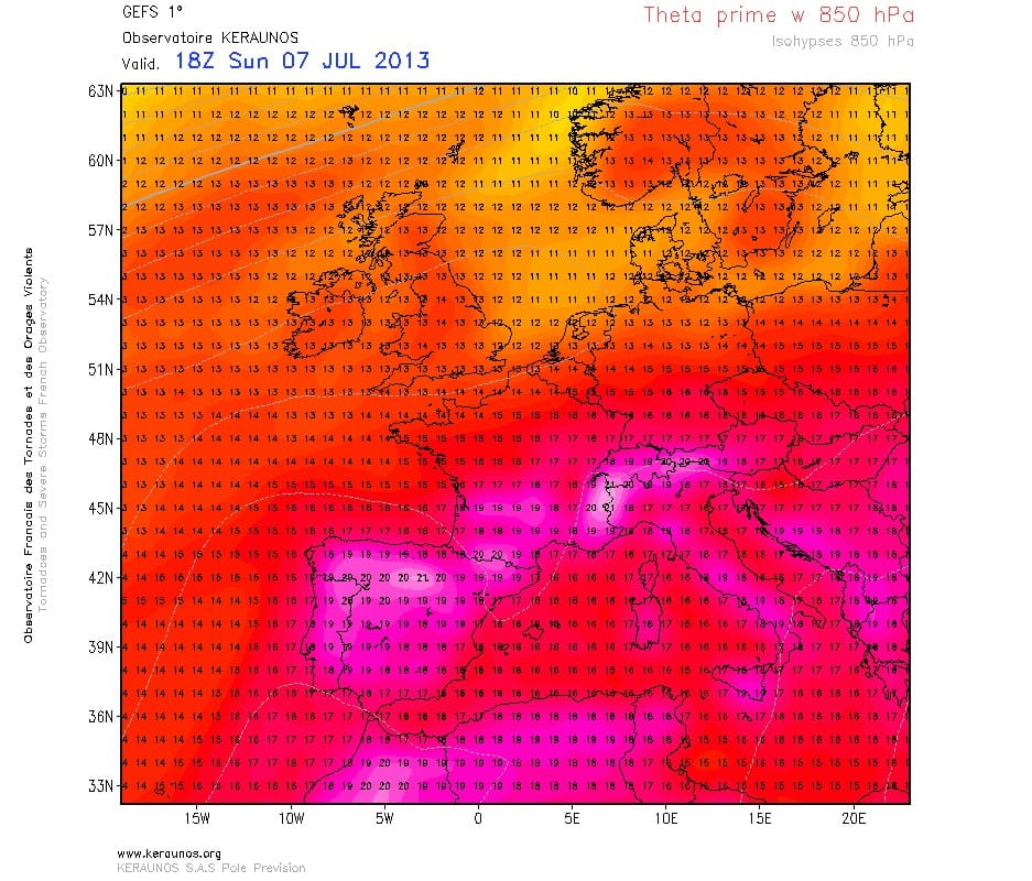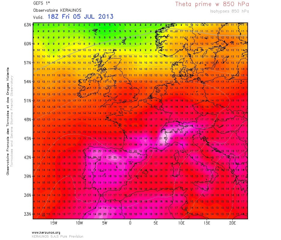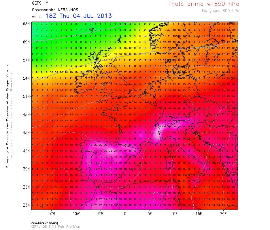 Thêta'w 850 hPa prévue pour le jeudi 4 juillet (à gauche) et pour le vendredi 5 juillet (à droite) à 20h locales. Moyenne des scénarios GEFS. Run du 27.06.2013 06Z.