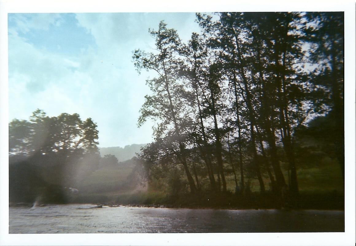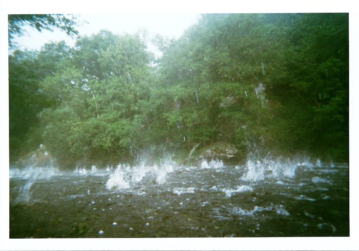 La photo de gauche (argentique) est prise sur la Sioule, au pied du Chateau-Rocher (on regarde vers le sud). on y voit les grêlons tomber dans l'eau. Le flou est dû à la condensation sur la lentille.