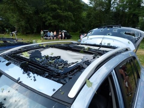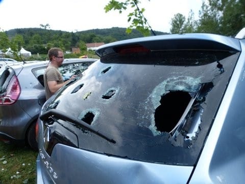 Florian GUERARD a fait parvenir à KERAUNOS des clichés, pris sur le vif, lors de l'orage de grêle supercellulaire qui a touché les gorges de la Sioule dans l'après-midi du 5 août 2013. Les grêlons de 7 cm de diamètre ont sévèrement endommagé les véhicules stationnés près de la Sioule infligeant plusieurs milliers d'euros de dégâts. Cet orage a blessé des kayakistes (contusions, traumatisme crânien), touchés par des grêlons, comme en témoigne le cliché ci-contre.