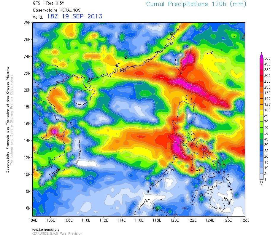 Le champ de précipitations en 120h, issu du dernier run de GFS 0.5 permet d'illustrer la trajectoire attendue du typhon. Les lames d'eau pourraient excéder 200 mm sur une bonne portion de l'axe suivi par le typhon jusqu'en début de semaine prochaine.