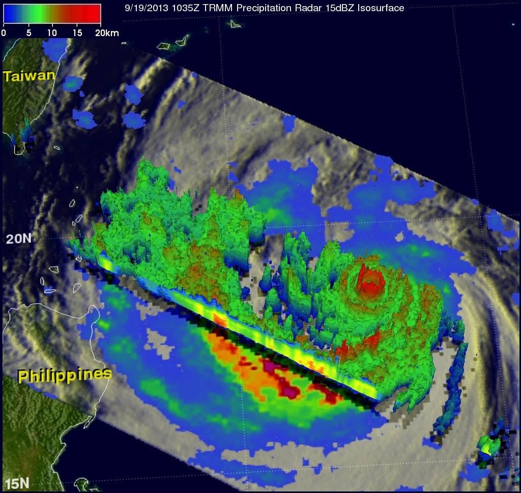 Hier dans la journée, au maximum de son intensité, le radar TRMM de la NASA a capturé un cliché assez remarquable, qui témoigne de la vigueur du typhon. Vers 10h30 TU, les sommets convectifs du mur de l'oeil ont été pointés à 15 km d'altitude. Sur le quadrant sud du système, quelques sommets à 16 km d'altitude ont été observés. Le cliche ci-dessous et les relevés effectués mettent clairement en évidence ces tours chaudes (hot towers), caractéristiques des cyclones tropicaux en cours d'intensification rapide.