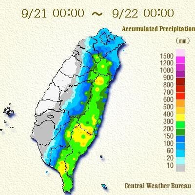 Les cartes ci-dessous, d'accumulation pour le 21 et le 22 septembre (jusqu'à 14h30 locales) illustrent l'ampleur des précipitations. Les hauts reliefs du centre de Taïwan ont produit un effet de foehn marqué sur la façade ouest de l'île (où il n'est pratiquement rien tombé).