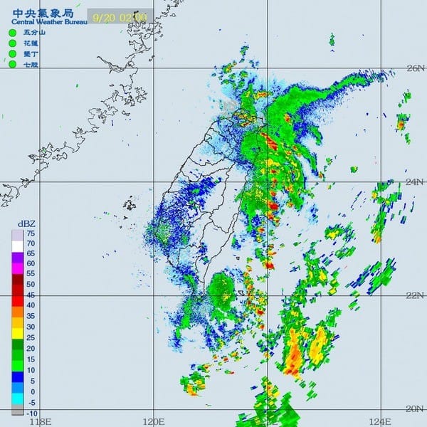 Ce matin, Usagi passe au sud immédiat de Taïwan (cf. image radar ci-contre). L'île est soumise à de fortes pluies, ayant produit des lames d'eau de 150 à 300 mm entre 00h et 15h locales sur la partie est seulement ; l'ouest étant soumis à un effet de foehn marqué. Sur ces dernières 48h, certains cumuls atteignent 400 mm. Des rafales de 165 km/h ont par ailleurs été relevées sur l'extrême sud de Taïwan.