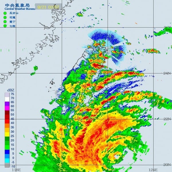 Durant l'après-midi, l'oeil du typhon a commencé à se contracter, un cycle de remplacement du mur de l'oeil (ERC) pouvait alors s'opérer. Un réchauffement des sommets convectifs près de l'oeil du cyclone a également été observé, de façon très temporaire. A l'heure de la mise à jour de ce point, une mise à jour de l'imagerie satellite micro-ondes récente n'est pas encore disponible. Elles sont essentielles à la confirmation de l'amorce de ce cycle.En attendant, les premières bandes convectives périphériques, encore très éloignées du centre du typhon, commencent à toucher Taïwan, comme en témoigne l'image radar des précipitations ci-contre.