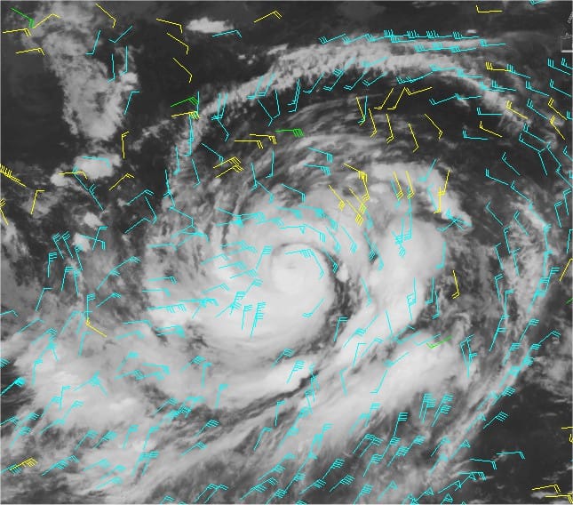 Les dernières données des images satellite confirment ce processus d'intensification encore en cours. Ainsi, le canal couleur 37 Ghz Windsat met en évidence l'ampleur de la convection profonde au sein du mur de l'oeil. Cette signature sur le canal 37 Ghz couleur est typique des systèmes tropicaux en phase d'intensification rapide. La température des sommets nuageux est inférieure à -90°C, se rapprochant des -100°C. La pression minimale estimée au centre du système est de 915 hPa.
