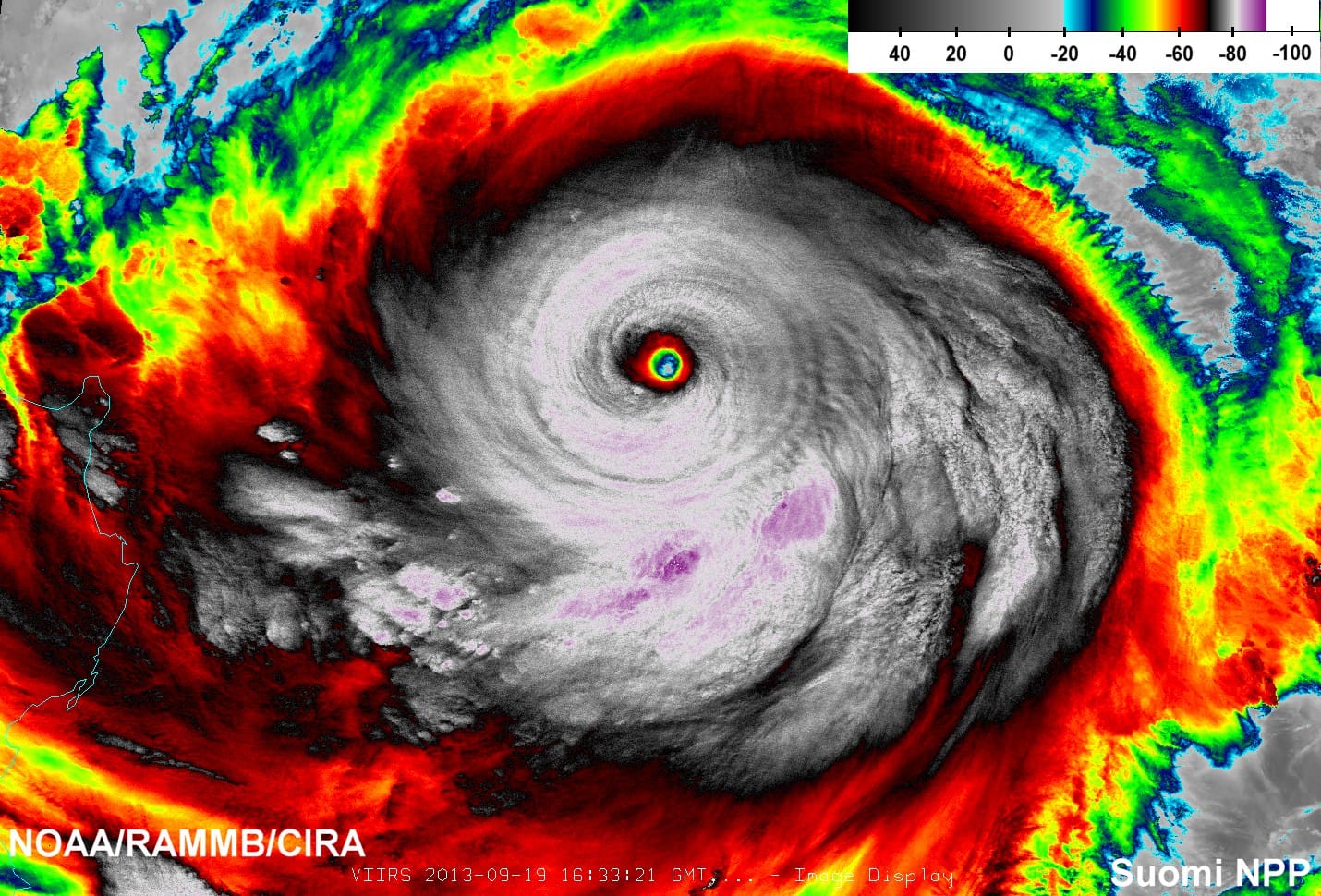 L'image ci-dessous (retravaillée par la NOAA/RAMMB/CIRA) témoigne une fois de plus de la puissance du cyclone, hier à son pic d'intensité. Usagi était alors un super typhon de catégorie 5, avec des vents soutenus de 140 noeuds et des rafales de 170 noeuds (> 300 km/h). Le cliché montre que la température au sommet des nuages s'est bien abaissée entre -95 et -100°C, sur le flanc sud du cyclone, soit une valeur tout à fait remarquable..