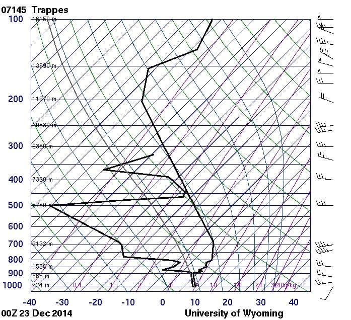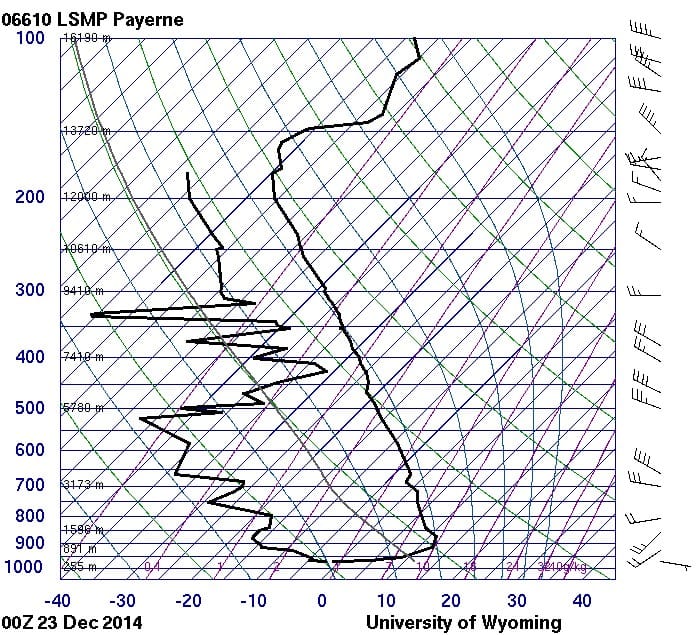 Le radiosondage de Payerne (Suisse) présenté ci-contre, tiré à 00h TU le 23 décembre confirme qu'une vaste zone s'étendant du nord de l'Espagne aux Alpes, est soumise à une masse d'air particulièrement sec entre les basses couches et l'étage moyen supérieur. Les données du sondage montrent une forte inversion près du sol, avec une température proche de -1°C vers 500 m d'altitude favorisée par le rayonnement nocturne. La température en air libre remonte rapidement à près de 12°C vers 970 m d'altitude. C'est également à partir de cette altitude que la masse d'air se montre la plus sèche, avec 15% d'humidité seulement. Le profil vertical est sec jusqu'à l'étage moyen supérieur ; à 500 hPa, une humidité relative de l'ordre de 3 à 5% est observée avec un point de rosée de l'ordre de -53°C.
