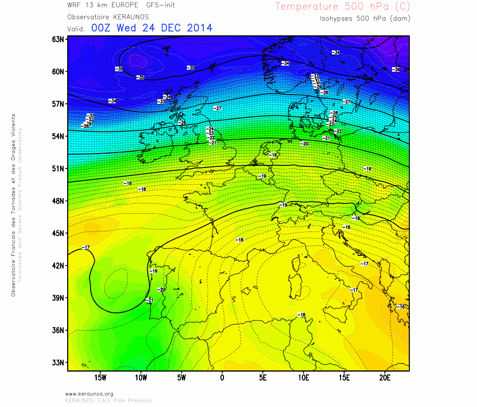 Une cyclogénèse doit s'opérer au sud-est de l'Islande d'ici vendredi 26 décembre. Le thalweg d'altitude associé est prévu migrer des îles britanniques vers le Golfe de Gênes entre le 27 et le 29 décembre. Une advection d'air froid devrait ainsi concerner la France.