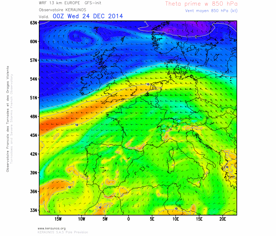 WRF 13 km : évolution de la température à 500 hPa, des thêta'w à 850 hPa et de l'instabilité du 24 au 26 décembre 2014