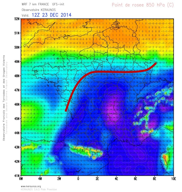 Champ de points de rosée à 850 hPa pour la mi-journée du 21 décembre (à gauche) et image satellite vapeur d'eau de 10h loc à droite