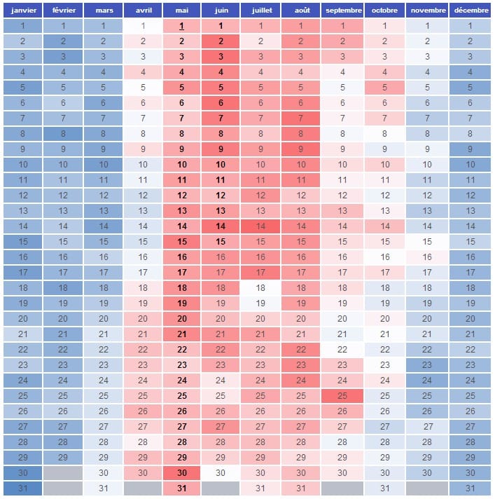 Ainsi, pour chaque jour de l'année, les informations suivantes peuvent être consultées :