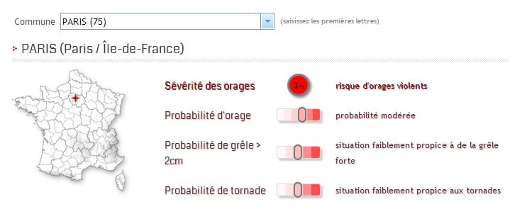 + un module de prévision géolocalisée est mis à disposition. Inédit, il permet d'évaluer de manière simple et rapide le niveau de risque orageux attendu dans la journée sur chacune des communes françaises.