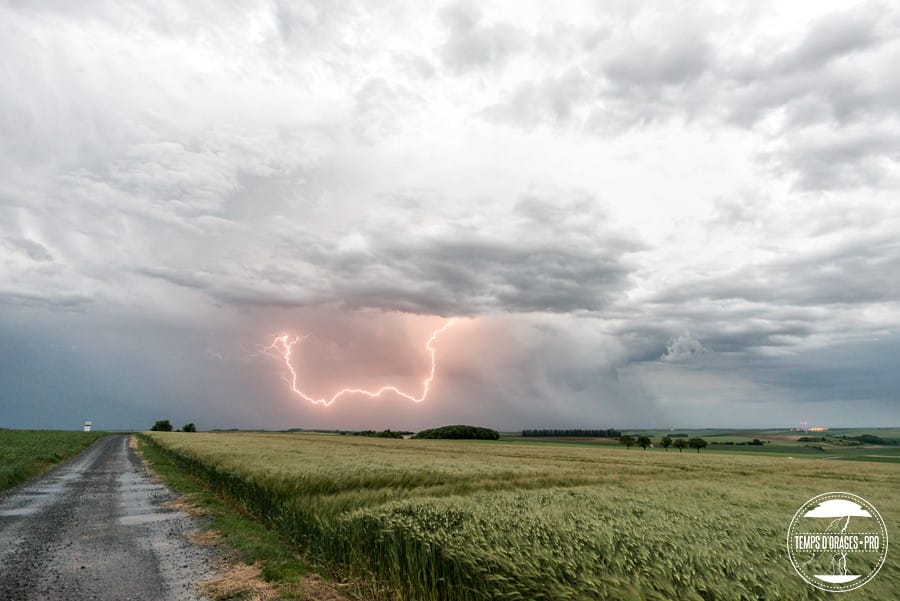 + la constitution d'un MCS avec un petit écho en arc (bow echo) entre Seine-et-Marne, ouest Champagne et Aisne en toute fin de journée. Chutes de grêle, rafales de vent de 80 km/h et fortes pluies ont été reportées à son passage. Le chasseur d'orages Xavier DELORME était sur place, en Champagne et a capturé plusieurs clichés. Un autre chasseur d'orages, Nils PIGERRE était également positionné, à Hermonville dans l'Aisne :