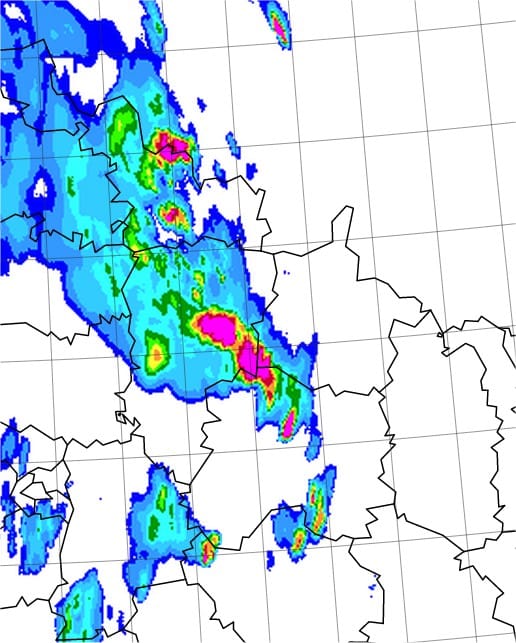 La convection s'accentue dans le sud-ouest, en particulier sur le Gers, et en limite de la Haute-Garonne. La zone est soumise à de forts cisaillements (hélicité 0-3 km atteignant 250 m²/s²) ; une cellule dévie depuis plusieurs dizaines de minutes du flux directeur d'environ 30° vers la droite. Une évolution supercellulaire est possible sur cette zone. Sur le sud du Gers, les cellules qui se développent deviennent bien vigoureuses également.En allant vers le nord, l'axe pluvio-instable demeure, entre l'est de l'Aquitaine, l'ouest du Limousin et le Centre/Ile-de-France. De petites cellules arquées se greffent sur le flanc est de cet axe mais ne génèrent a priori pas de phénomènes sévères à cette heure.