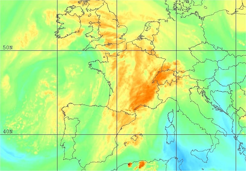 Le forçage d'altitude reste positionné sur le proche Atlantique ; la Bretagne étant dans l'air plus frais de basse couche, un peu à l'arrière du forçage. Les nuages apparaissant plus froids sur le sud-est du pays ne sont pas convectifs et font partie d'une masse nuageuse d'altitude qui s'étire dans le violent flux de sud (cirrus, altostratus).