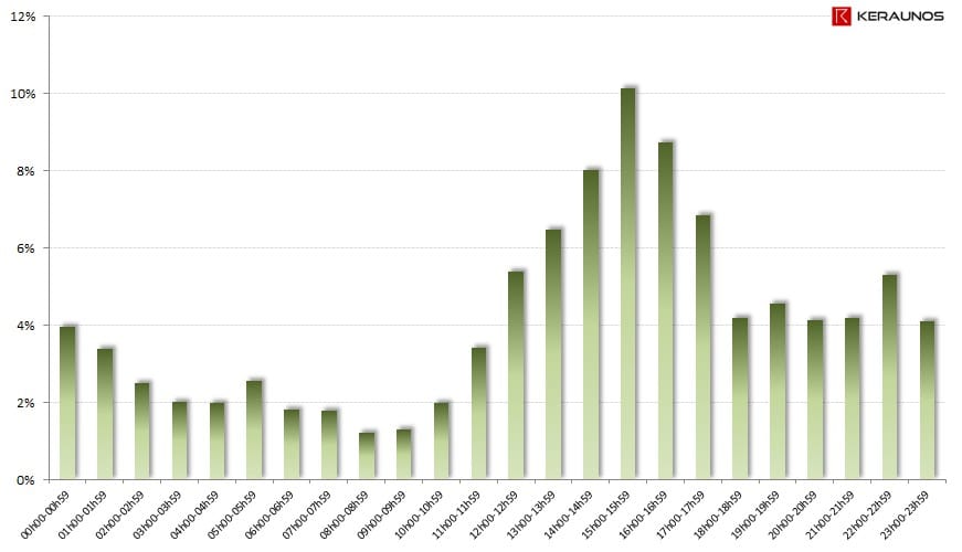 Le graphe ci-dessous illustre la répartition moyennée sur la période de 45 jours des horaires des impacts de foudre détectés. Le pic d'activité orageuse est ainsi maximal entre 15h et 16h locales puisque près de 10% des impacts observés se sont produits durant ce créneau horaire. On constate un recul de 2h au niveau du pic d'activité orageuse par rapport à l'été 2014, ce qui est tout à fait normal compte tenu de la période à laquelle nous sommes. Mais on note toutefois une activité plutôt soutenue en nocturne, aussi bien en fin de soirée qu'en milieu de nuit.