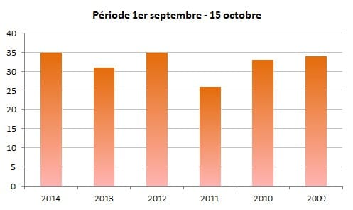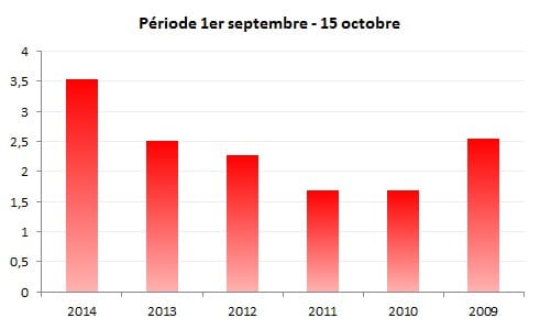 L'I.S.O moyen ressort à 3,6 pour la période 01/09 - 15/10/2014. Il s'agit de la valeur la plus élevée depuis la mise en place de l'indicateur en 2009. La différence avec la période 01/09 - 15/10/2009 est importante puisque plus d'un point sépare les deux périodes, ce qui est en soit très significatif.