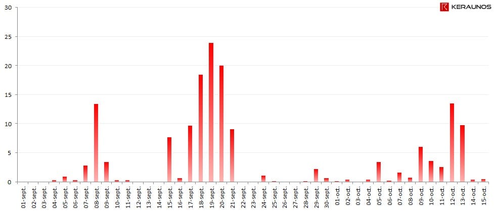 Répartition horaire des impacts de foudre détectés au cours de l'été - © KERAUNOS / données blitzortungAfin d'évaluer la sévérité des orages, l'analyse de l'indicateur de sévérité orageuse permet d'établir que la journée du 19 septembre 2014 reste la plus orageuse de la période. Néanmoins, la journée du 12 octobre 2014 s'est montrée bien orageuse avec un I.S.O à 13,6.