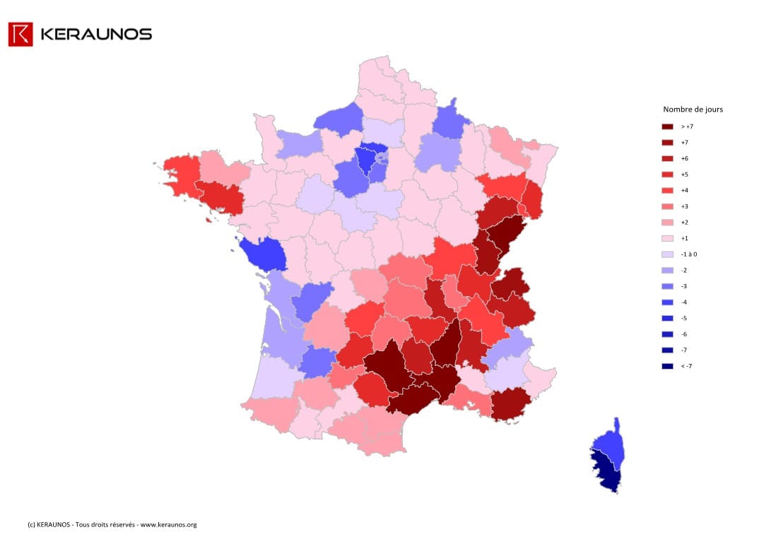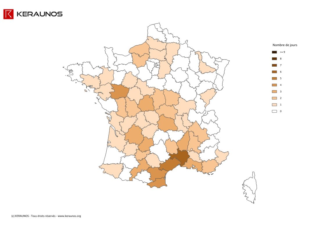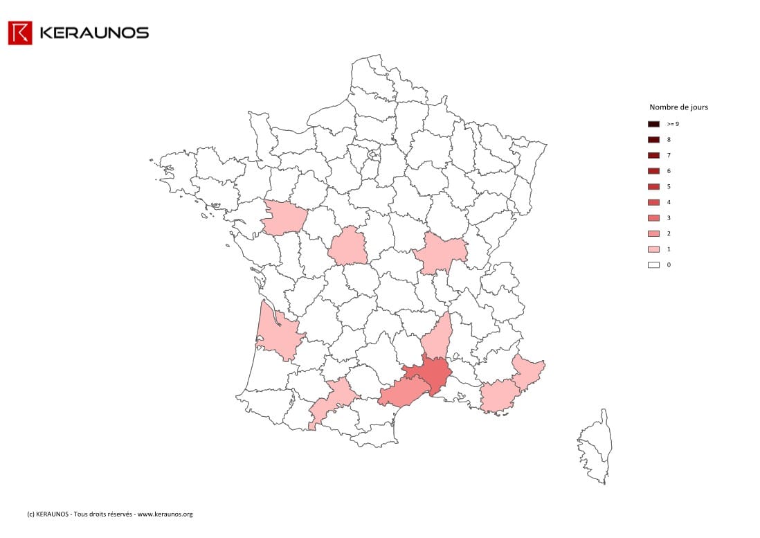 Cet excédent ne se résume toutefois pas aux seuls départements languedociens puisque l'activité orageuse a été très fréquente sur un axe s'étendant du Massif-Central au Jura, en passant par le sud de la Provence où 8 à 13 jours avec orages sont enregistrés.