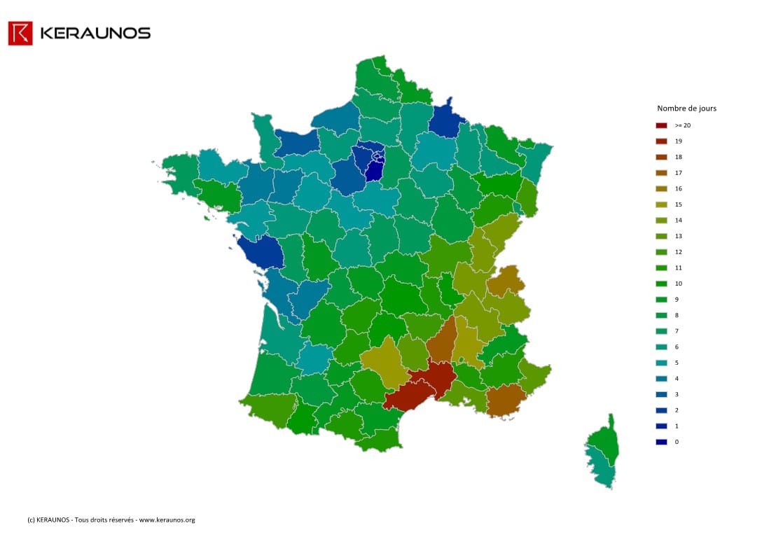 Au 15 octobre, c'est l'année 2014 qui comptabilise le nombre de journées avec orage le plus élevé. Avec 229 jours, la période devance nettement 2013 qui comptabilise 217 jours.